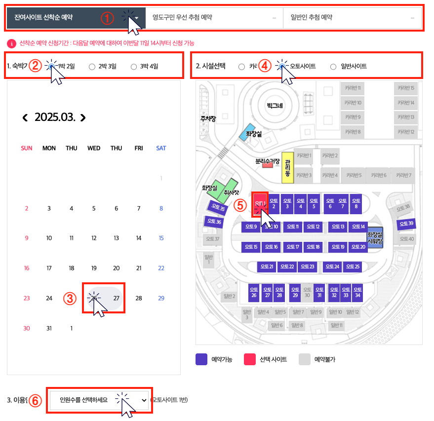 - 이용 인원 선택 : 이용 인원수를 선택합니다. (이미지에서 "⑥" 클릭)