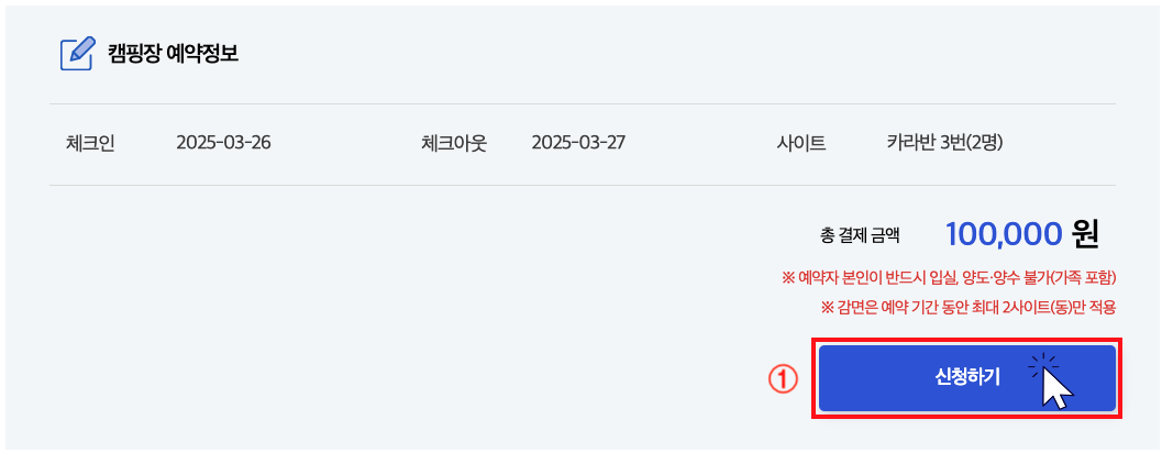 - 앞에서 선택한 예약정보를 확인 후 "신청하기" 버튼을 클릭합니다. (이미지에서 "①" 클릭)