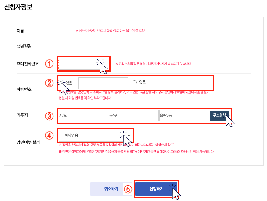 - 신청자 정보를 입력 후 "신청하기" 버튼을 클릭합니다. (이미지에서 "⑤" 입력)