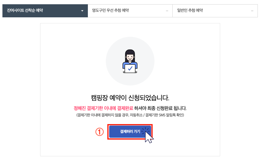 - 정해진 결제기한 이내에 결제완료 하셔야 최종 신청완료 됩니다. (이미지에서 "①" 클릭)