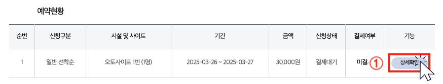 - 결제를 진행하기 위해서 "상세확인" 버튼을 클릭하여 진행합니다. (이미지에서 "①" 클릭)